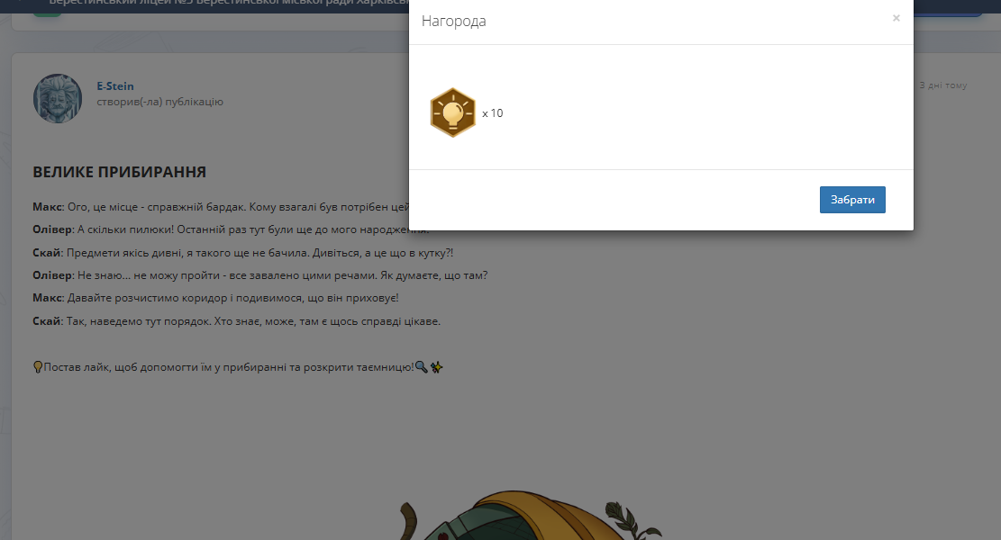 Рис. 2 — Відкритий квест - Виконати зазначені дії (наприклад: прочитай матеріал, виконай завдання, постав лайк, залиш коментар).