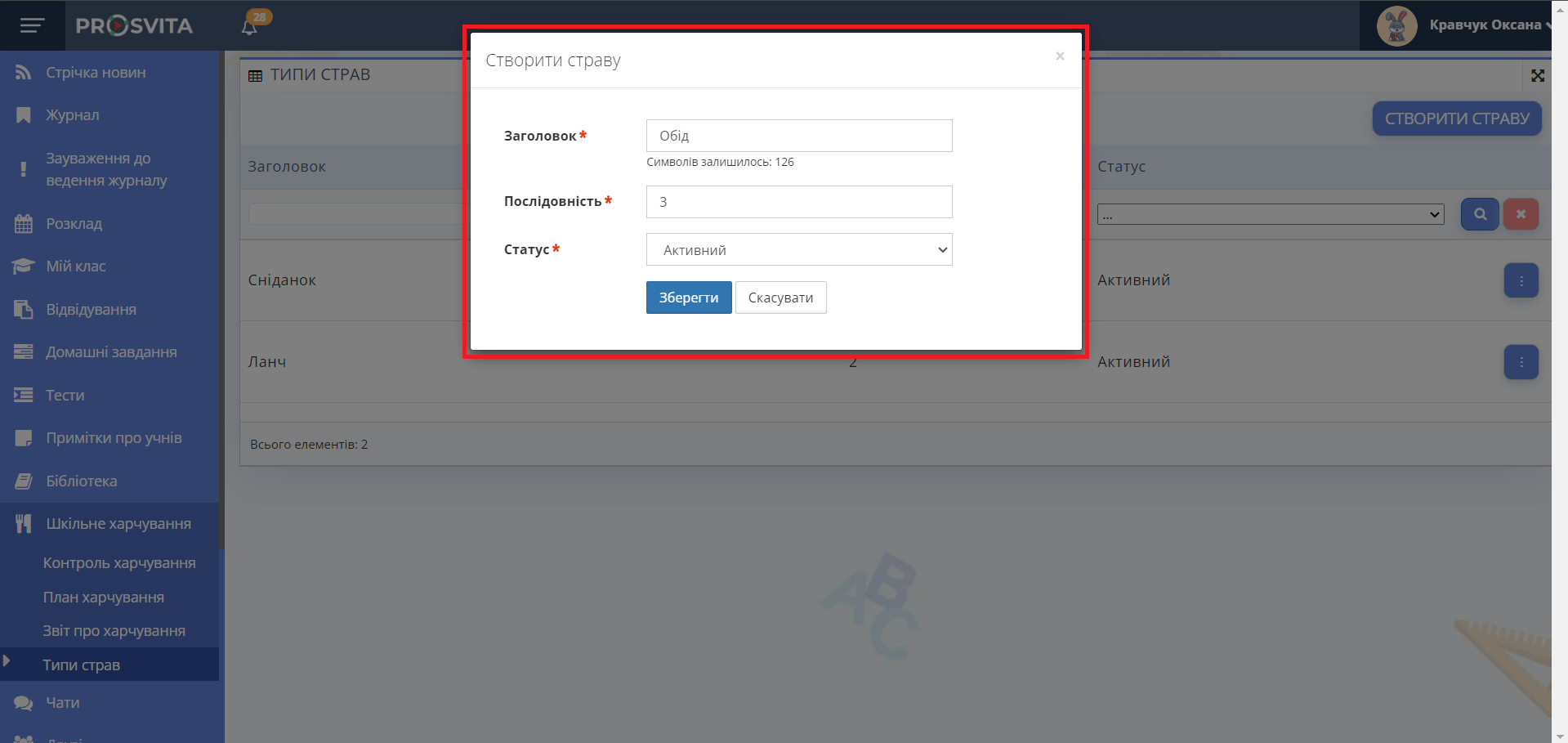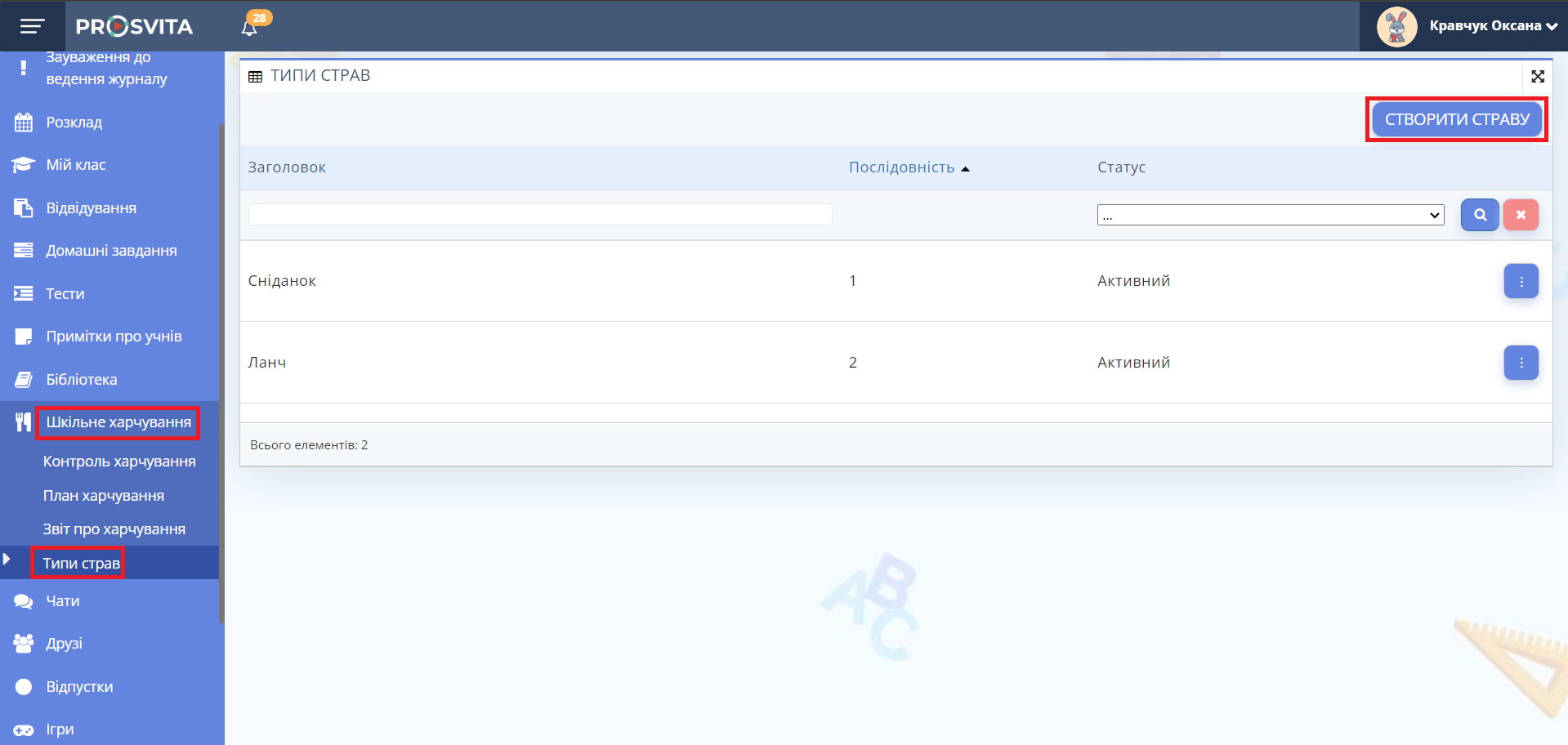Перейдіть у розділ "Шкільне харчування" -> "Типи страв".