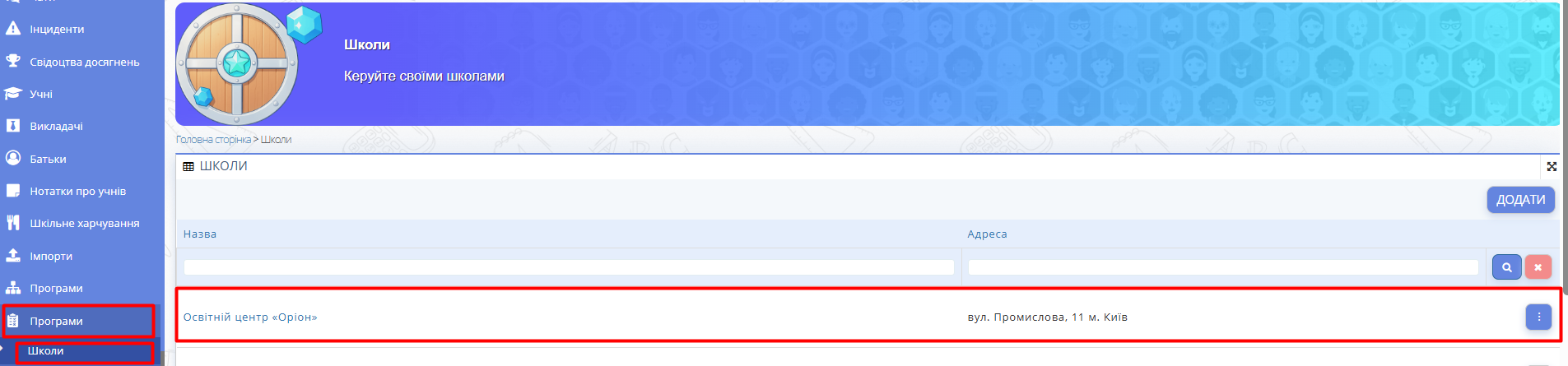 - У головному меню перейдіть до розділу Програми → Школи.