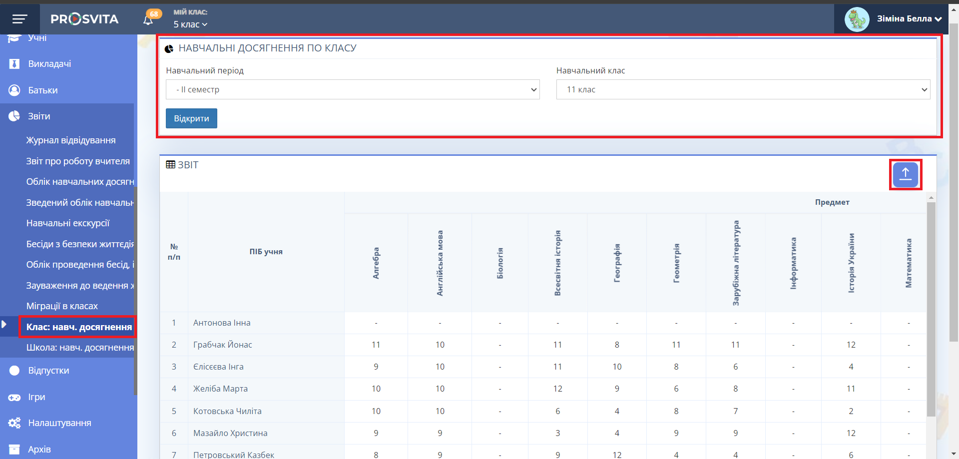- Перейдіть в меню "Звіти" -> "Клас: навчальні досягнення".