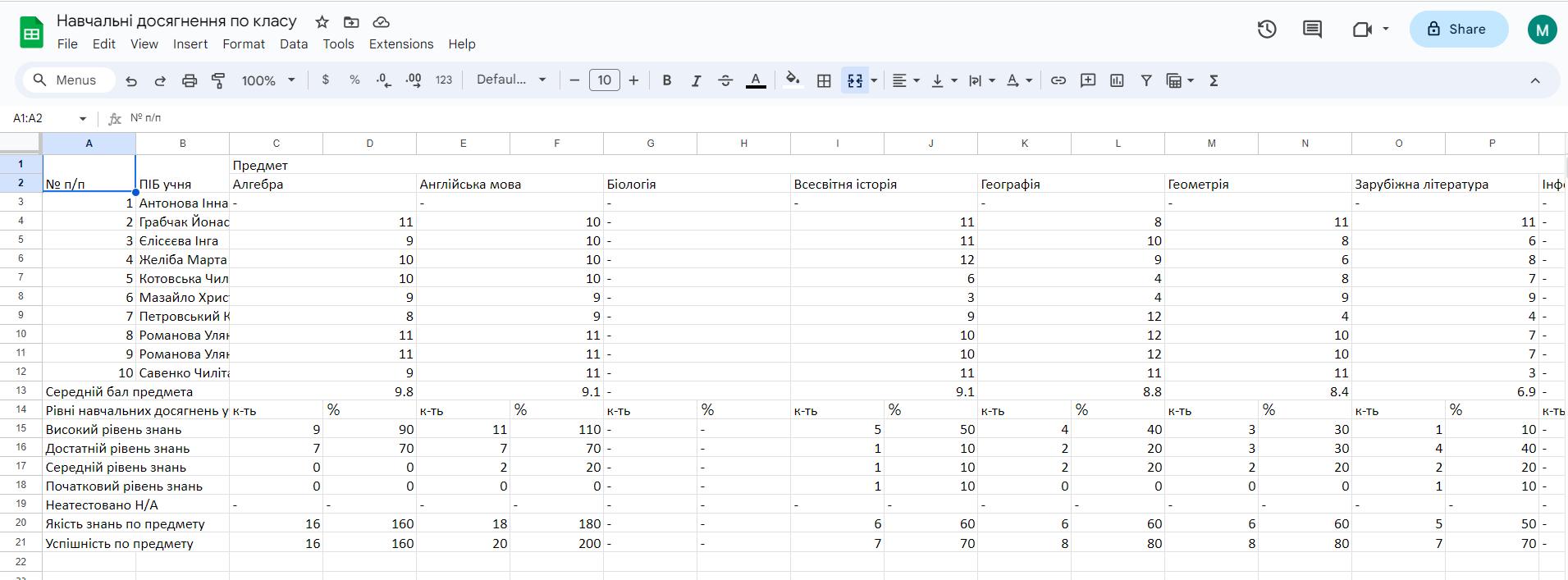 Рис. 28. Зовнішній вигляд сторінки "Клас: навч. досягнення" - Відкрийте завантажений файл для перегляду звітності по класу за обраний період.