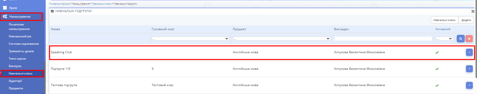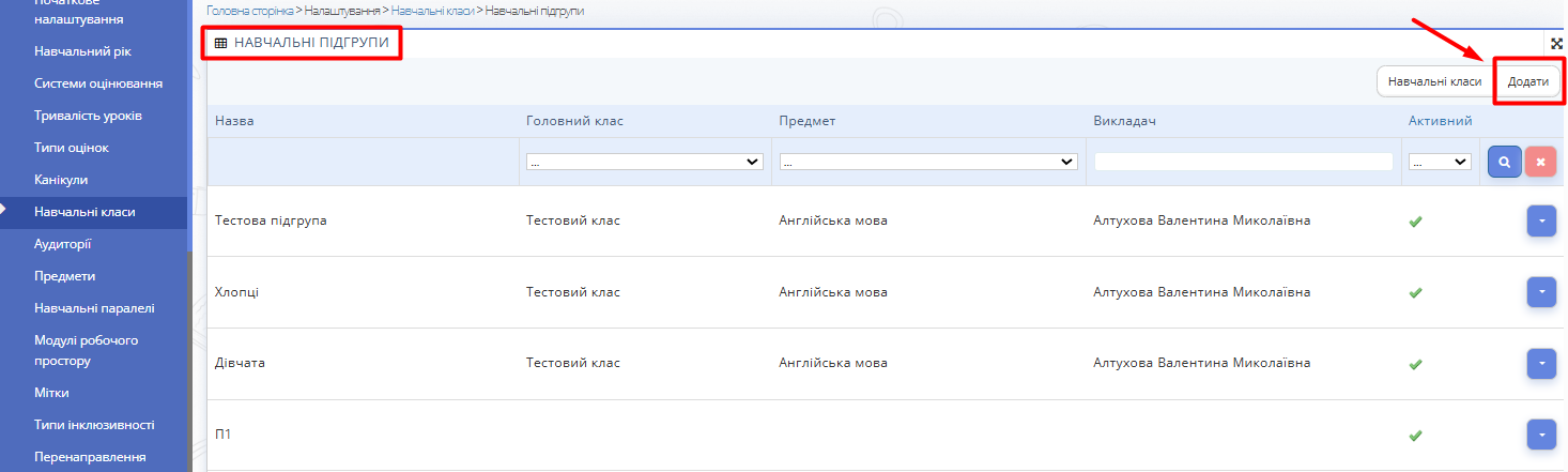 Рис. 2 — Кнопка "Додати" - У вікні, що відкрилося, введіть назву групи, головний клас, викладача, предмет і поставте галочку "Активний".