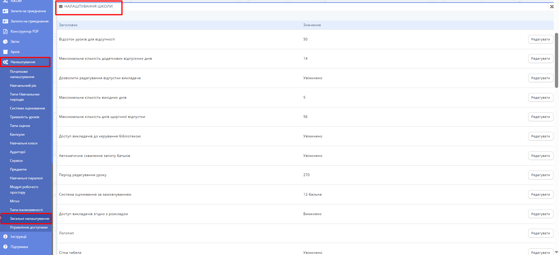 Адміністрація закладу має змогу провести певні додаткові налаштування. Для цього Користувач повинен перейти у розділ меню "Налаштування" -> "Загальні налаштування". (Рис. 1)