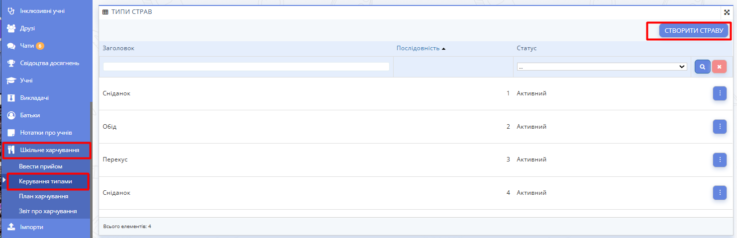 Перейдіть у розділ "Шкільне харчування" -> "Керування типами".
