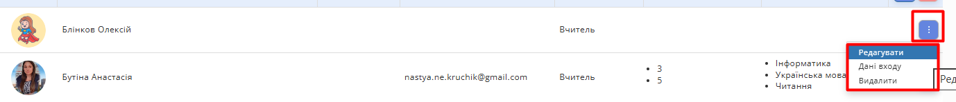 Потрібно натиснути на синю іконку контекстного меню справа від імені викладача та обрати опцію "Активувати".