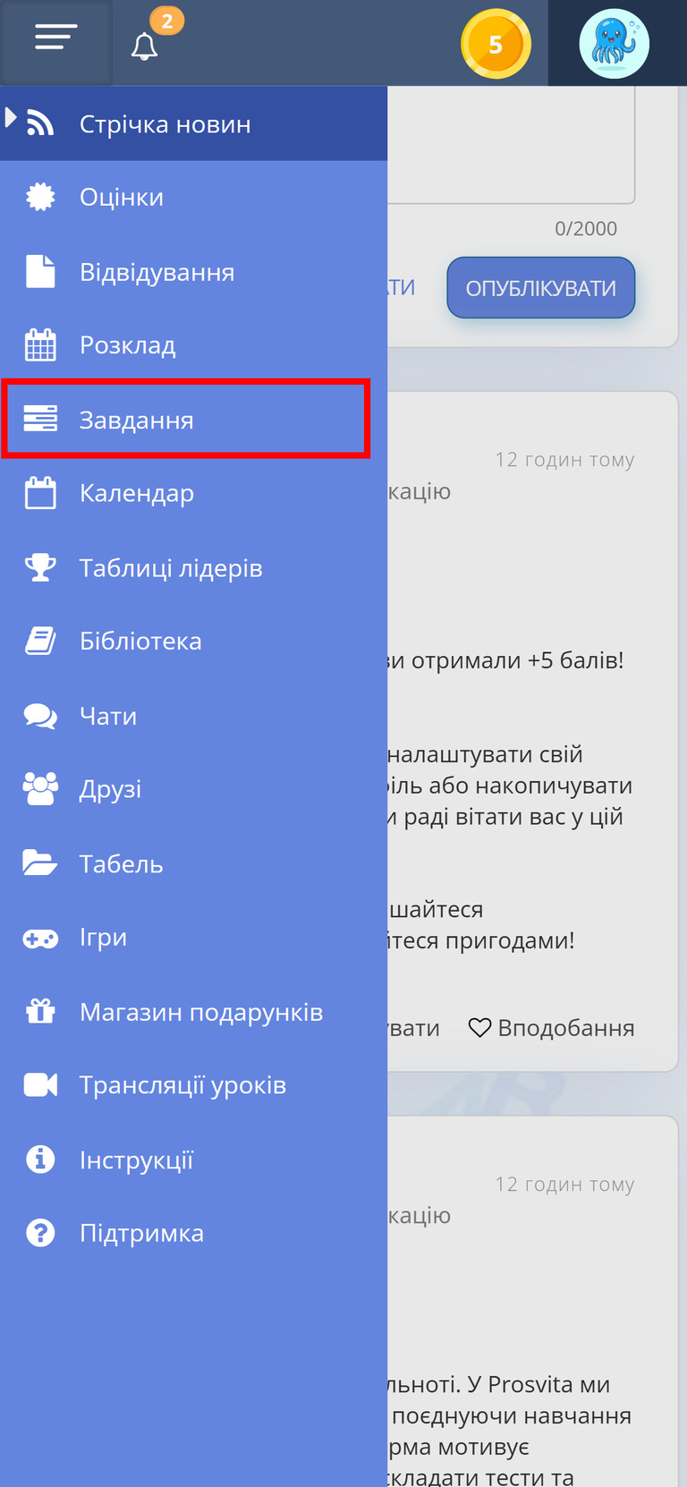 Рис. 1 — Пункт меню "Завдання" - Перегляньте список завдань. Тут ви побачите всі завдання — як домашні, так і завдання на уроці. Щоб відкрити конкретне завдання, натисніть кнопку "Переглянути". Невиконані домашні завдання з'являються першими у списку.