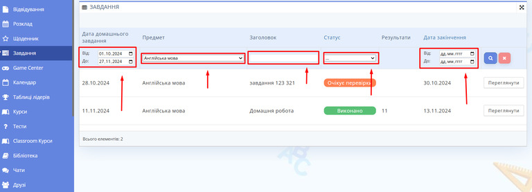 Рис. 2 — Список завдань - Якщо ви хочете розширити можливості пошуку, скористайтеся фільтрами у верхній частині сторінки. Ви можете вказати дату, коли завдання було задано, обрати конкретний предмет, знайти завдання за його змістом, вибрати статус виконання завдання або встановити дедлайн для завдання.
