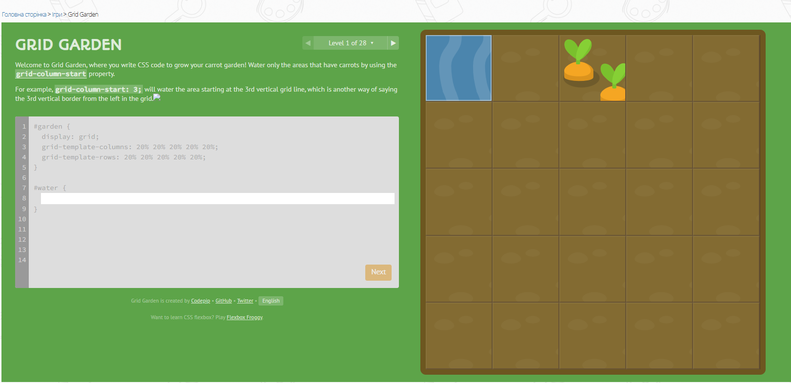 Grid Garden — це навчальна гра-браузерна головоломка, яка допомагає опанувати CSS-селектори через інтерактивне завдання з поливом грядки.