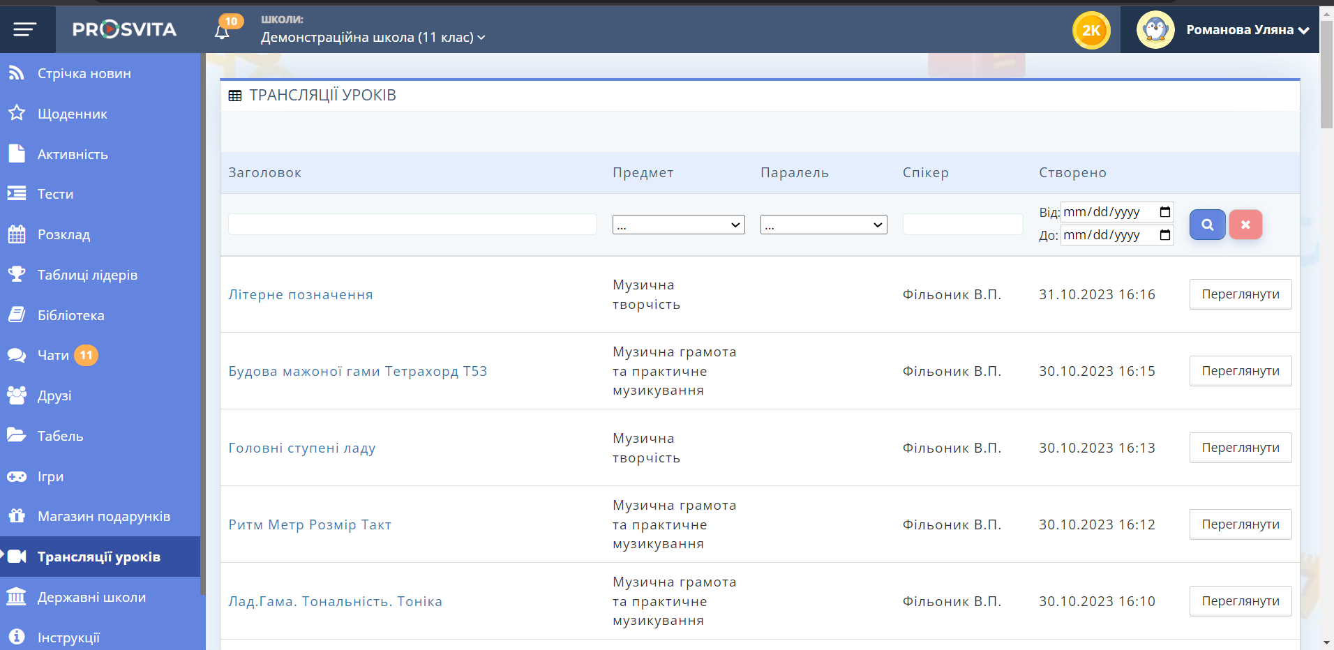 Трансляції уроків Перегляд запису уроку¶ ⚠️ Доступ до записів уроків може бути обмежений. Кроки¶ Перейдіть до розділу "Трансляції уроків". Натисніть кнопку "Переглянути" біля потрібного уроку. Рис. 1 — Вигляд сторінки "Трансляції уроків"