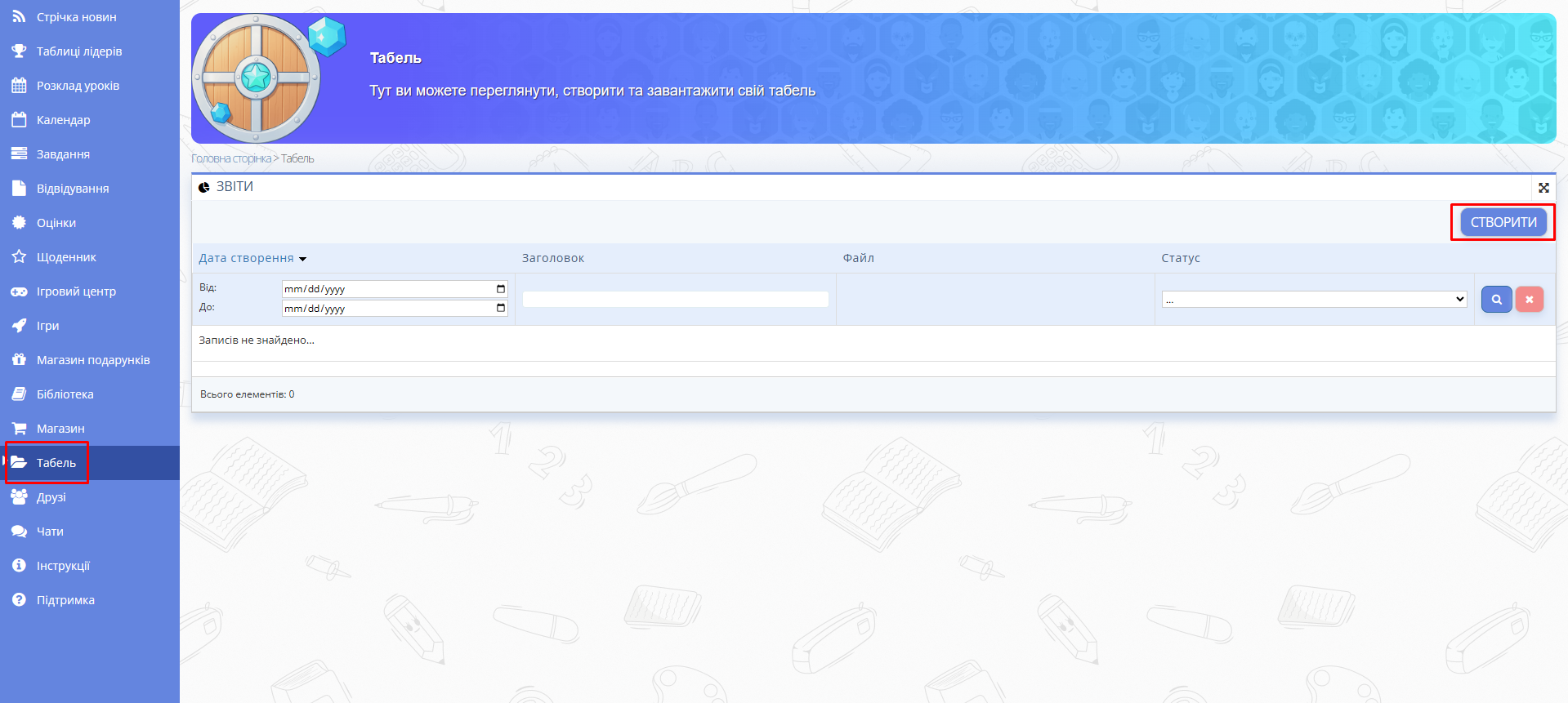 Рис. 1 — Розділ «Табель» із кнопкою «СТВОРИТИ» -
