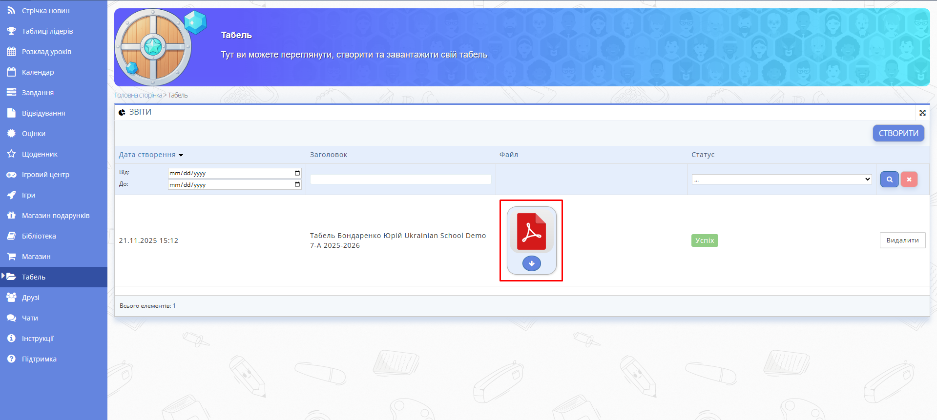 Коли статус зміниться на «Успіх», табель буде готовий. У рядку з’явиться іконка PDF та синя стрілка вниз. Щоб завантажити табель на комп’ютер, натисніть на синю стрілку під іконкою PDF.