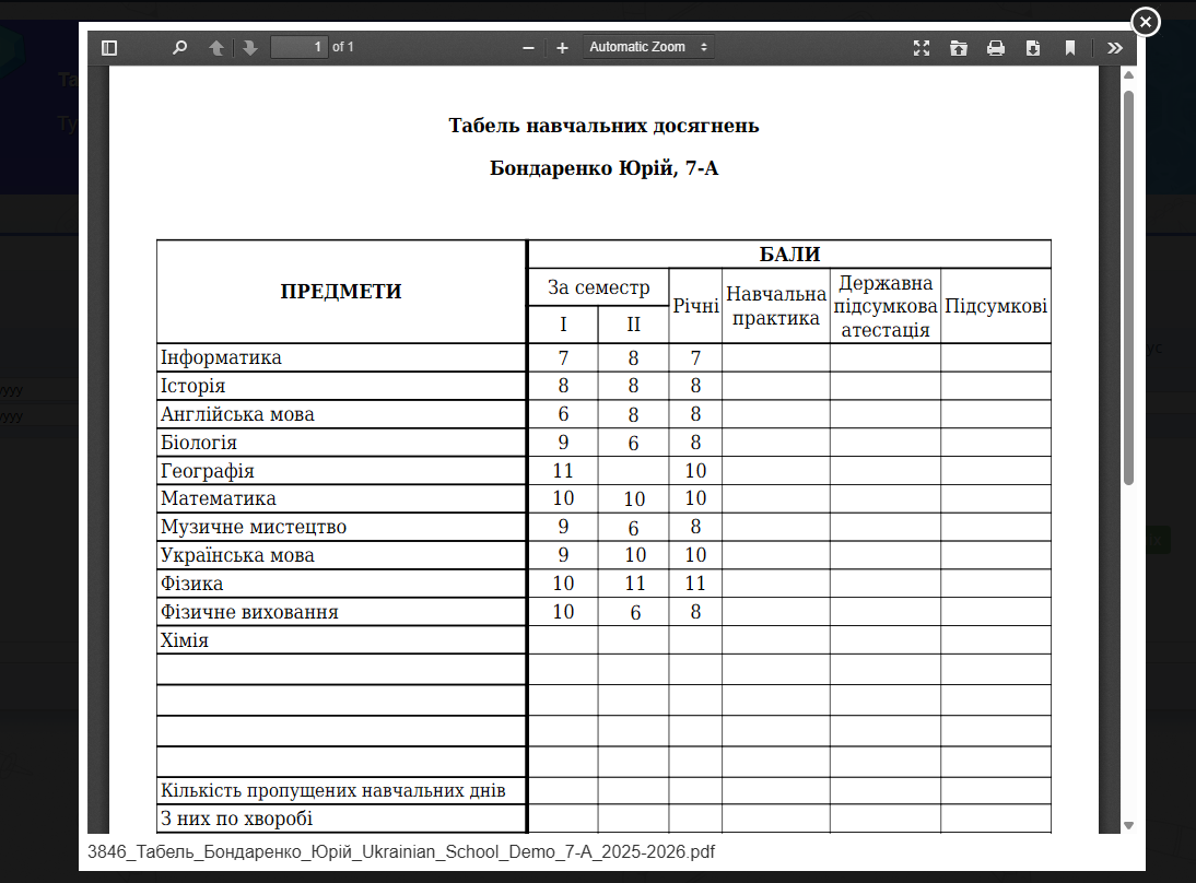 Рис. 5 — Перегляд табеля навчальних досягнень у форматі PDF