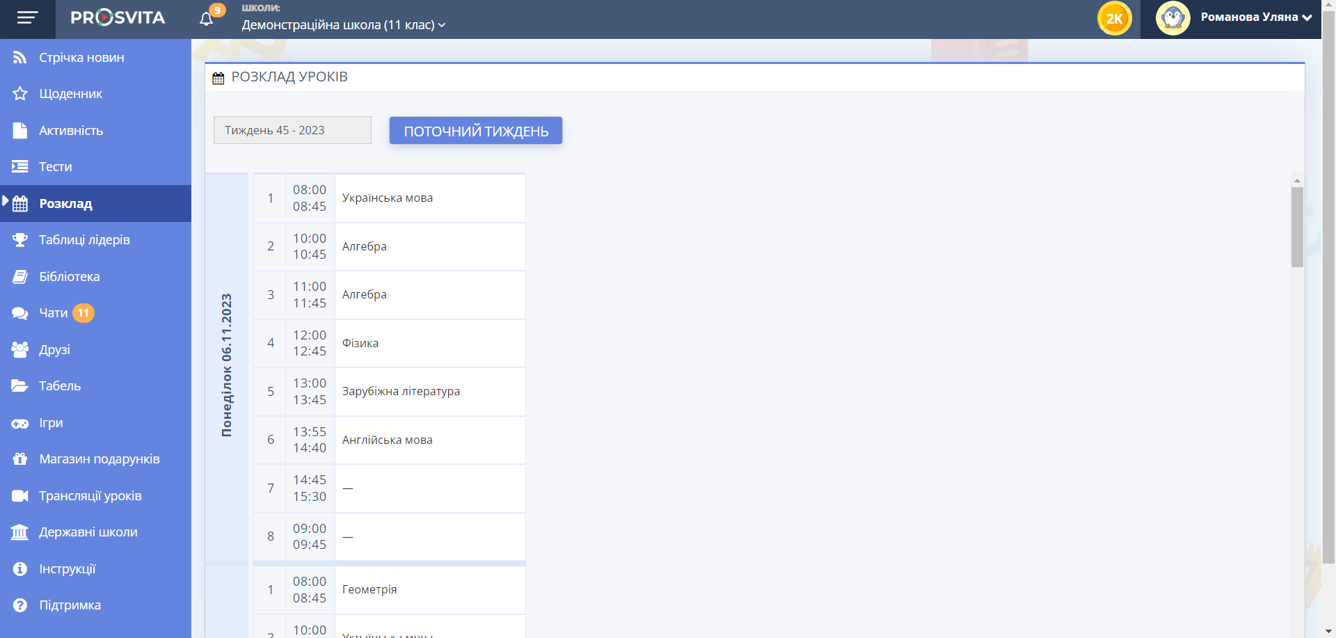 Розклад Розклад¶ ⚠️ Детальний розклад уроків з'являється автоматично на сторінках "Розклад" та "Щоденник" після того, як його сформує адміністрація навчального закладу на платформі. Кроки¶ Перейдіть на сторінку "Розклад". Тут ви знайдете розклад уроків на поточний тиждень. Рис. 1 — Вигляд сторінки "Розклад"
