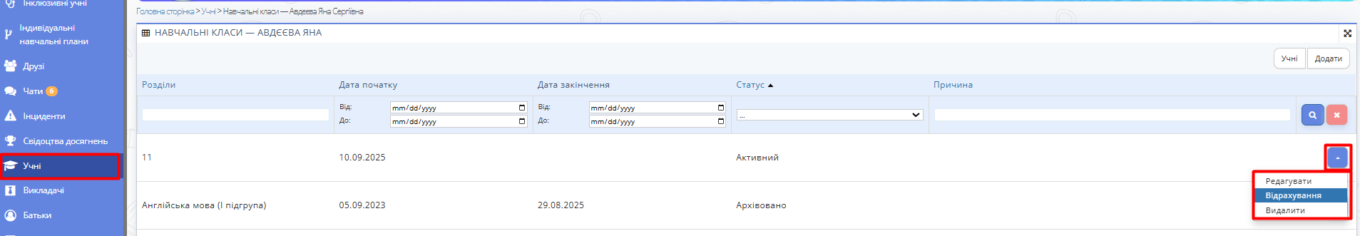 ⚠️ Після відрахування з класу учень автоматично видаляється з усіх підгруп, у яких був.