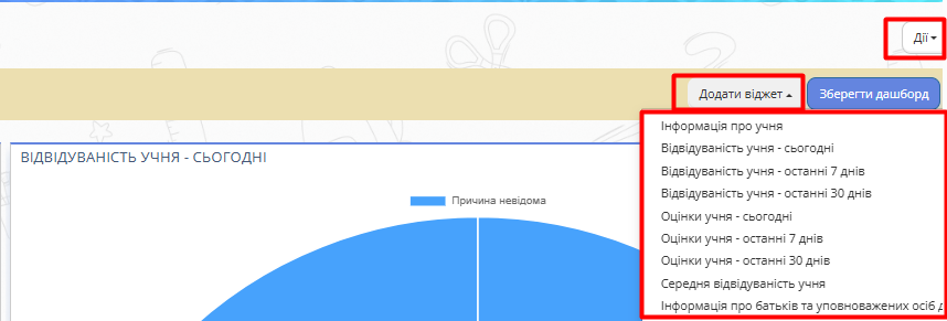 Дешборд можна редагувати або перейменувати через кнопку “Дії” у правому верхньому кутку, обираючи потрібні віджети.