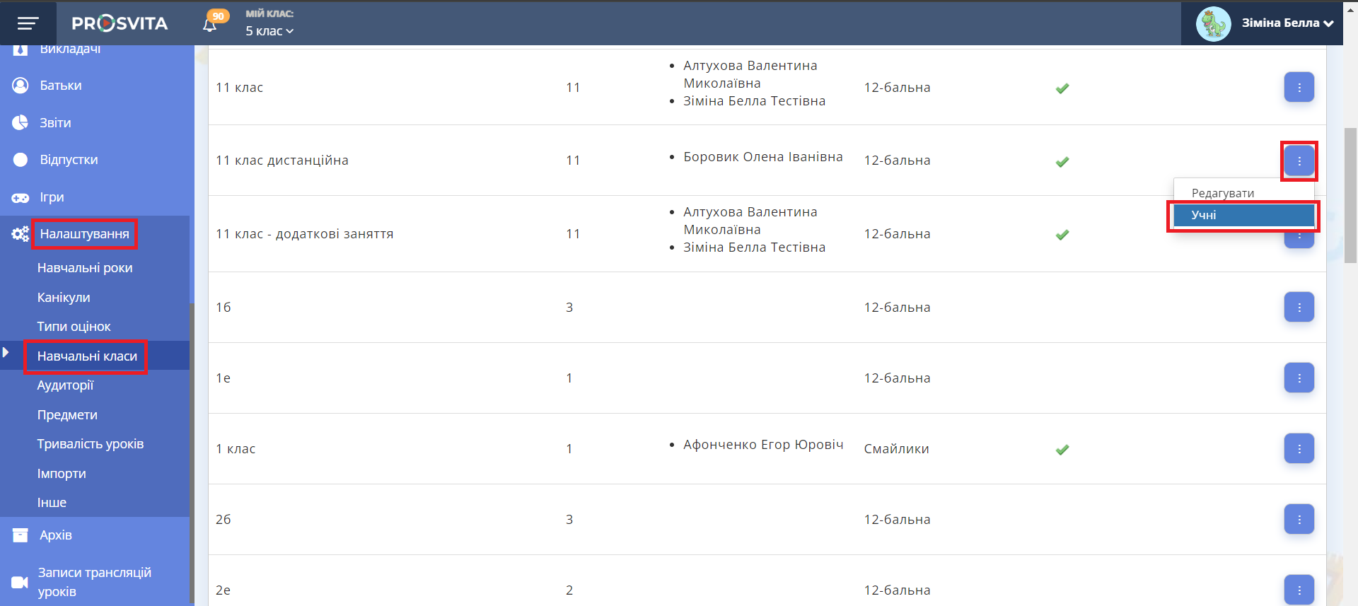 Перейдіть у розділ Налаштування → Навчальні класи.
