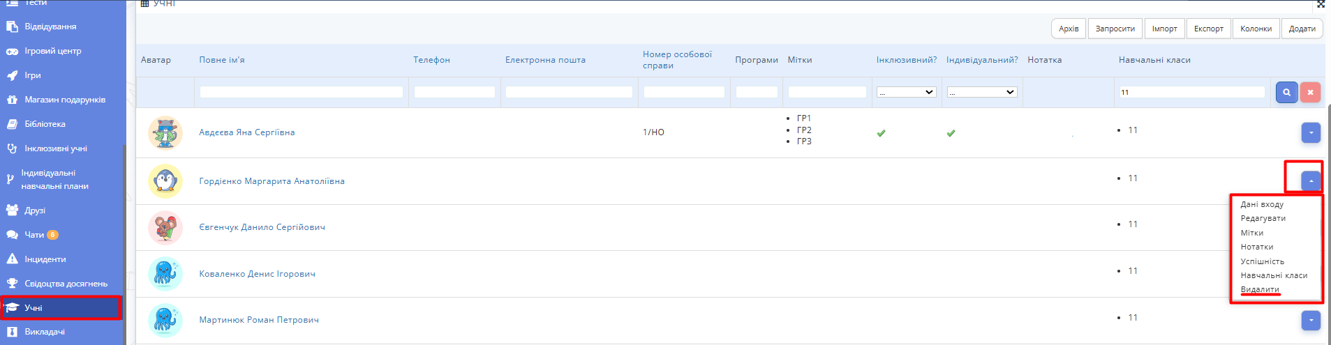 ⚠️ Після видалення учня вся інформація про нього зникне з журналу класу та підгруп.