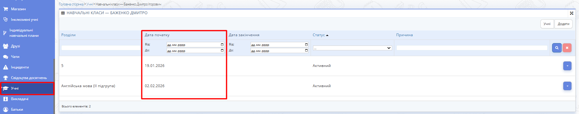 2.4. Відредагуйте дату початку навчання для учня в статусі "Активний".